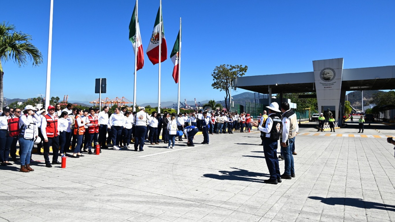 La totalidad del personal de la Administración del Sistema Portuario Nacional Manzanillo participó al mediodía de este miércoles en el Macro Simulacro Estatal de Sismo realizado en todo el Estado para fomentar la cultura de la prevención y el cuidado ante catástrofes sísmicas.